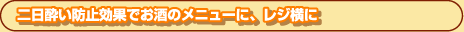 お酒の席の食前や、または飲みながらの服用で効果があるため、お酒のメニューに一緒に表示したり、またレジカウンターにポップを置いていただければお客様にもお求め頂けやすい商品です。